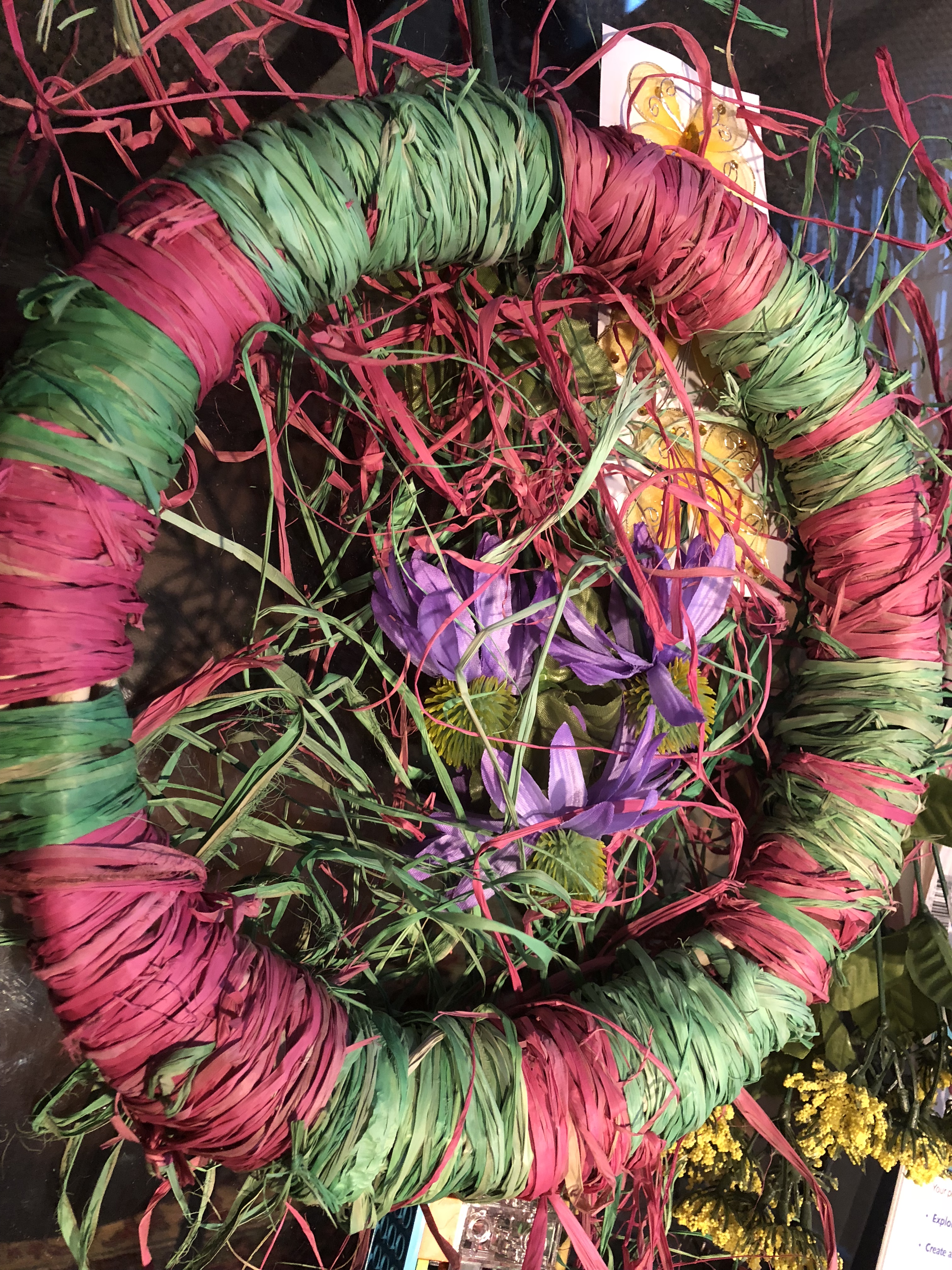My daughter was excited to help me with this project. We decided to wrap the raffia around the wreath and chose our favorite colors, pink and green to form a pattern. This was a little messy in the beginning but we managed to finish the wrap. We were able to secure the raffia to the wreath with knots. After we finished wrapping the wreath, we added on the accessories and final touches.
